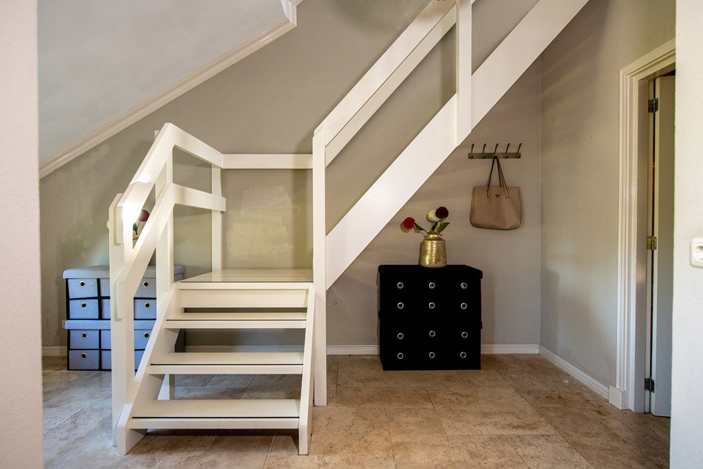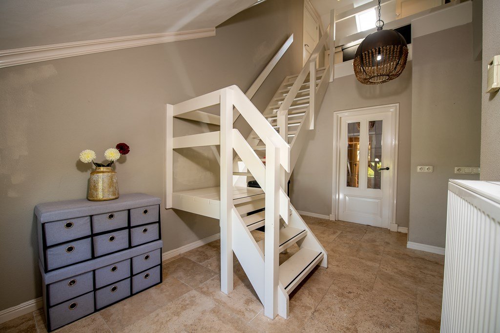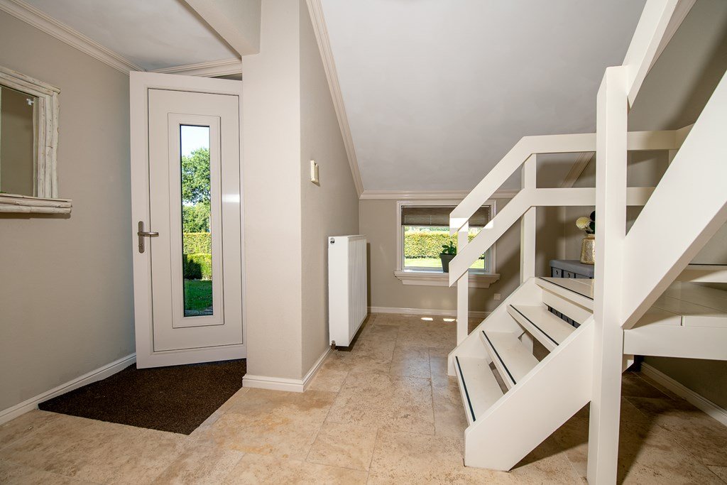 Het tuinpad vanuit de weg aan het Hoofdkanaal leidt naar de entree van de woning met ruime garderobe en stijlvolle trap naar de bovenverdieping.