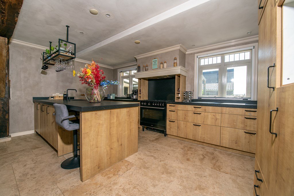 De woonkeuken met uitzicht op de achter gelegen tuin en de loungehoek aan de raamkant bij de voortuin brengen meteen de sfeer van heerlijk tafelen en genieten. De royale en luxueus uitgevoerde keuken, voorzien van hardstenen blad, een vrijstaand 6-pits gasfornuis met oven en afzuigunit en diverse inbouwapparatuur zoals een vaatwasser, koelkast, combimagnetron en Quooker, staat via de openslaande ramen in directe verbinding met de veranda.