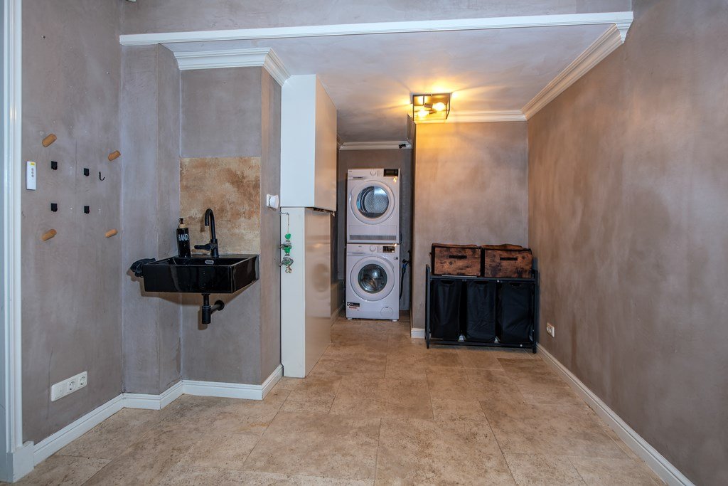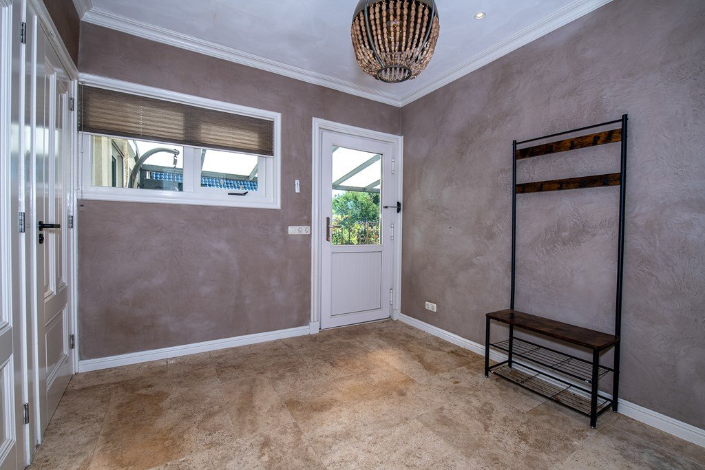 Vanuit de centrale hal komt u in de garderobe met daaraan gesitueerd het toilet en een royale badkamer. Aan de andere kant van de hal liggen de comfortabele bijkeuken en een kantoorruimte.
