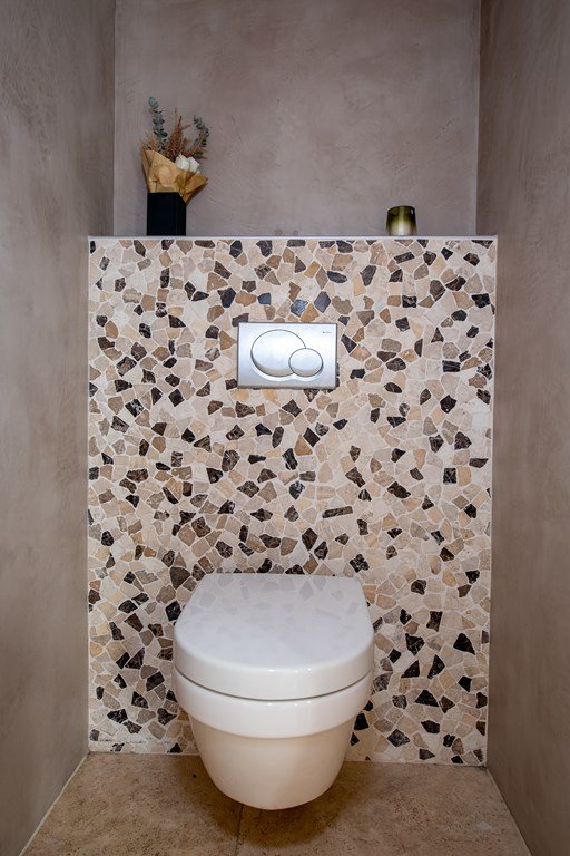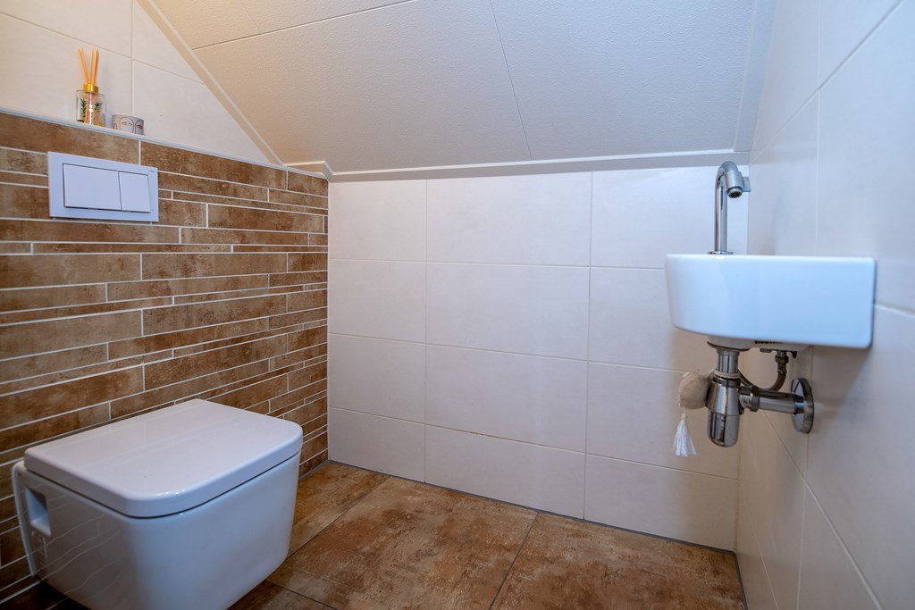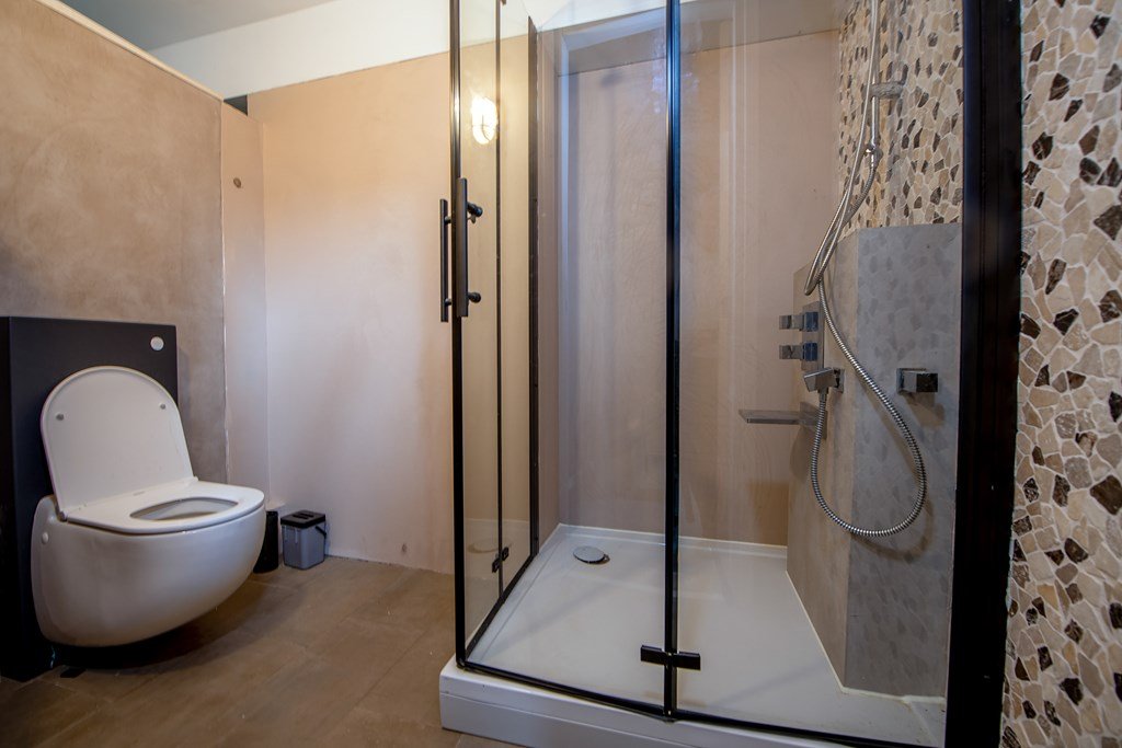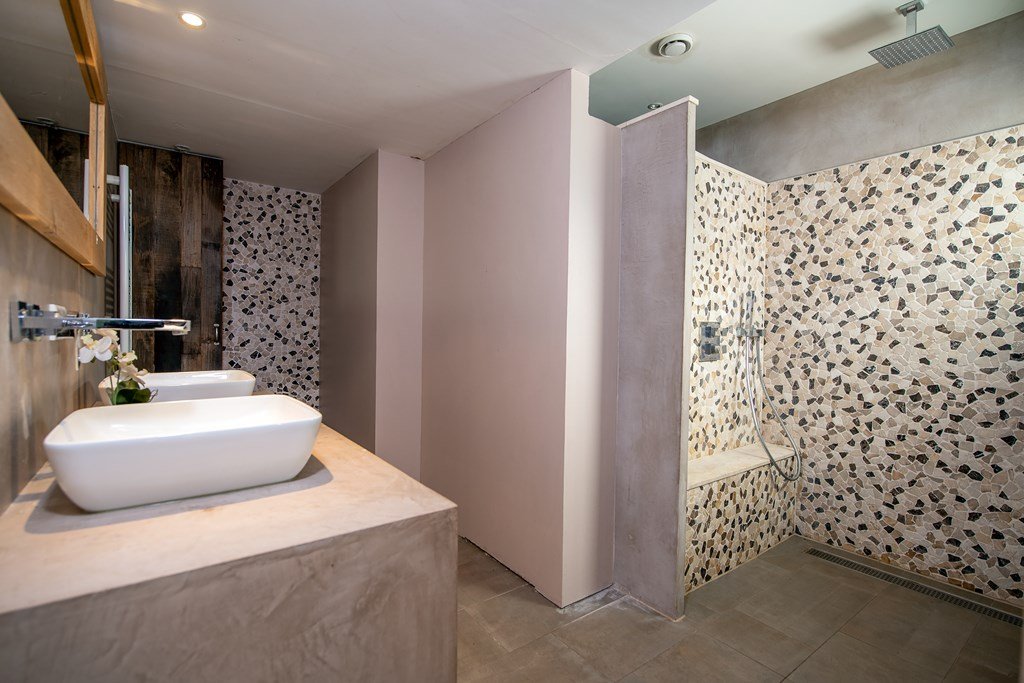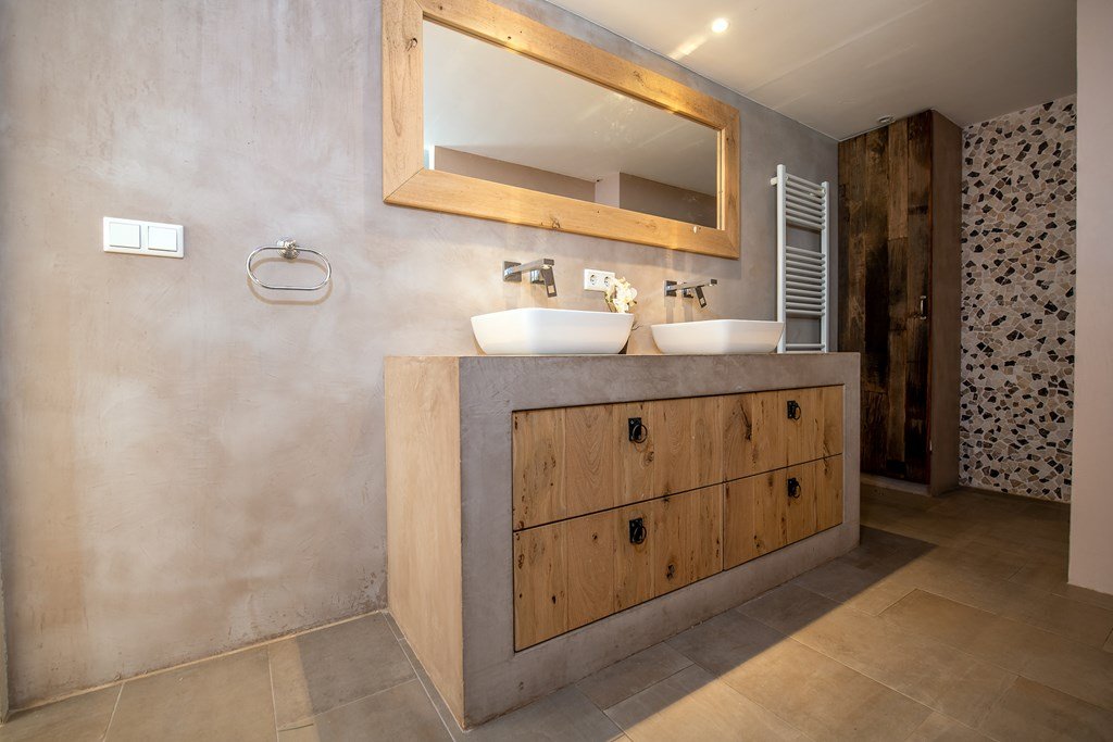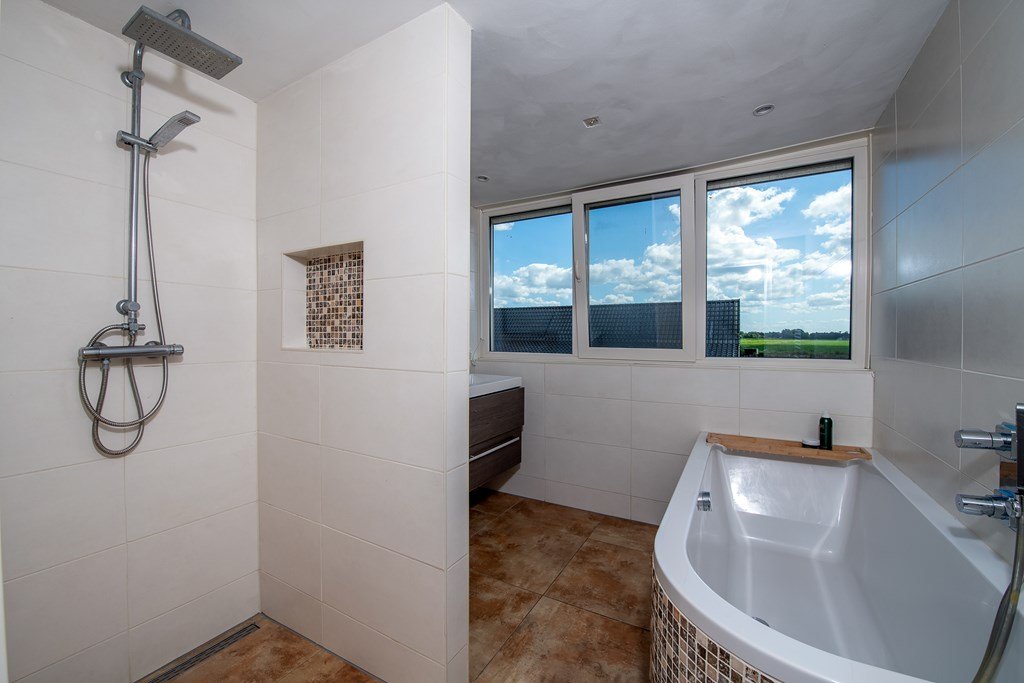 De luxueuze badkamer is voorzien van een inloopdouche, dubbele wastafel en vloerverwarming, het separate toilet en de ruime slaapkamer maken dat de woonboerderij uitermate geschikt is voor levensloopbestendige bewoning.