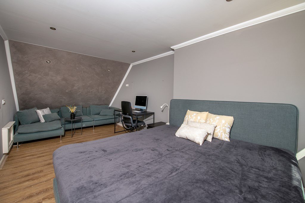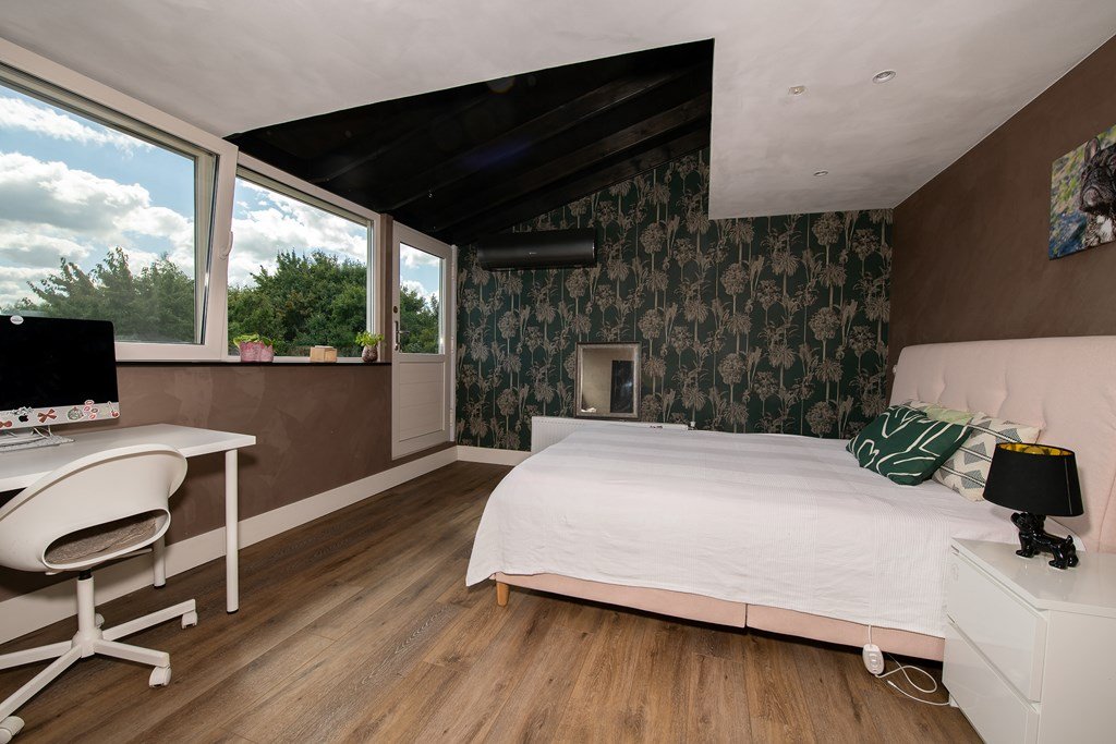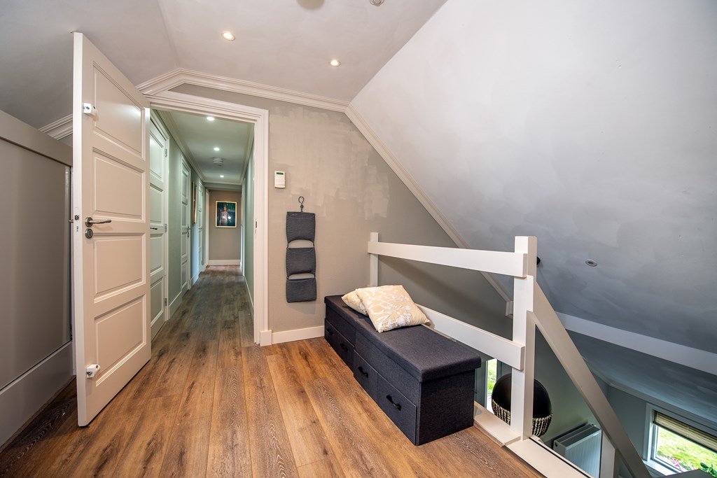 De trap in de entree van de woonboerderij leidt naar de bovenverdieping met vier ruime slaapkamers, waarvan één voorzien van airconditioning, met daarnaast een ruime kast en een 2e comfortabele badkamer, voorzien van ligbad, inloopdouche, dubbele wastafel en een separaat toilet. Een royale verdieping voor slapen en/of werken!
