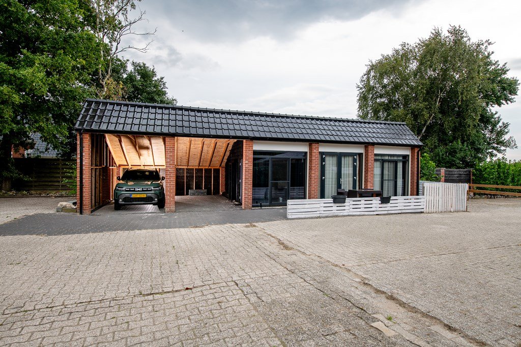 De kapschuur/carport op het erf aan de achterzijde biedt ruimte voor het stallen van twee auto’s én heeft een B&B onder zijn dak die is voorzien van een keuken en badkamer met toilet, douche en wastafel.