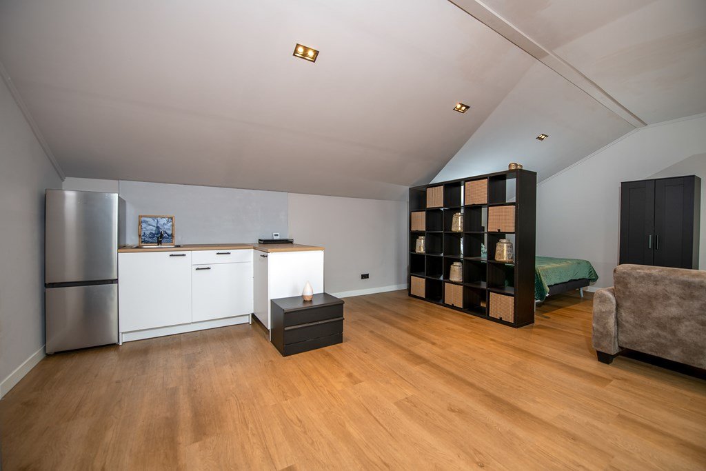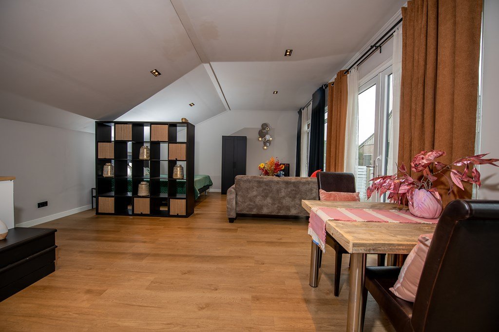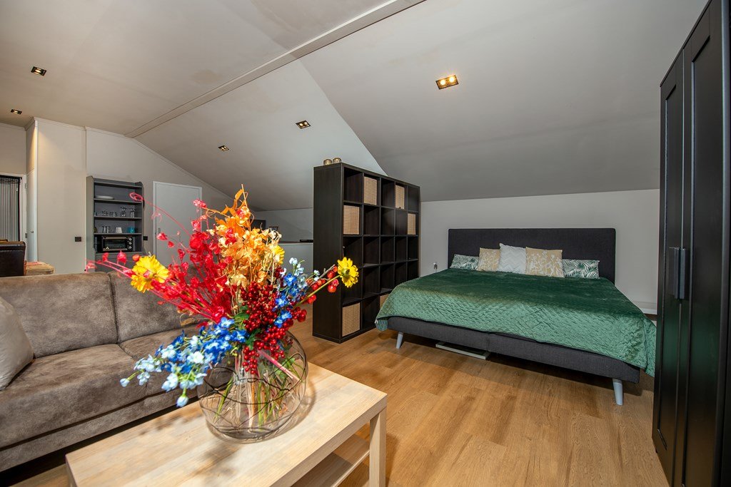 De ruime living is door suitedeuren gescheiden van de woonkeuken en heeft alle mogelijkheden om rond de brandende kachel behaaglijke zithoeken en -hoekjes te maken. Naast de living bevindt zich een ruime slaapkamer waarvan de openslaande deuren direct leiden naar het buitenterras aan het zwembad.