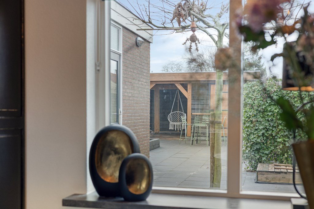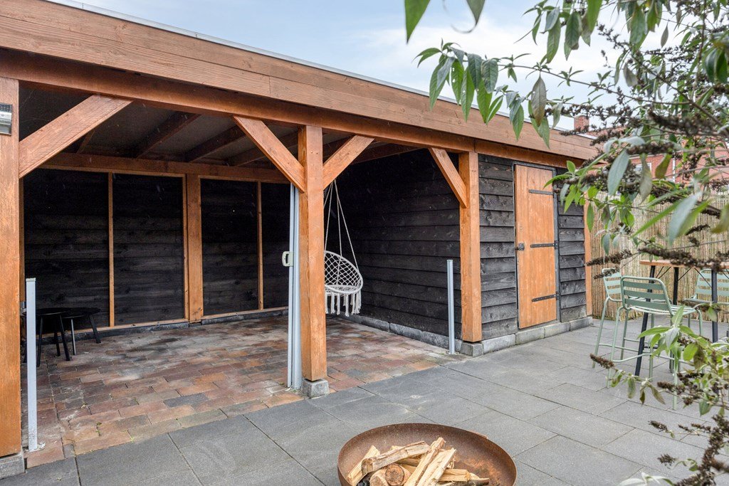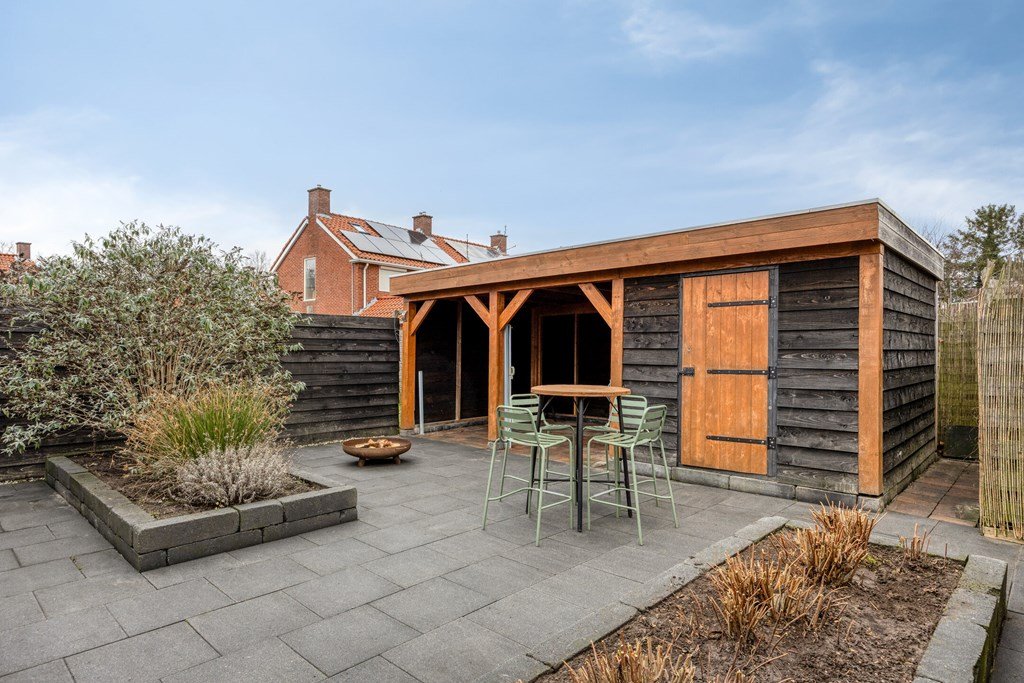 De deur in de bijkeuken leidt naar de geheel betegelde en comfortabel aangelegde achtertuin met houten tuinhuis/berging en veranda.