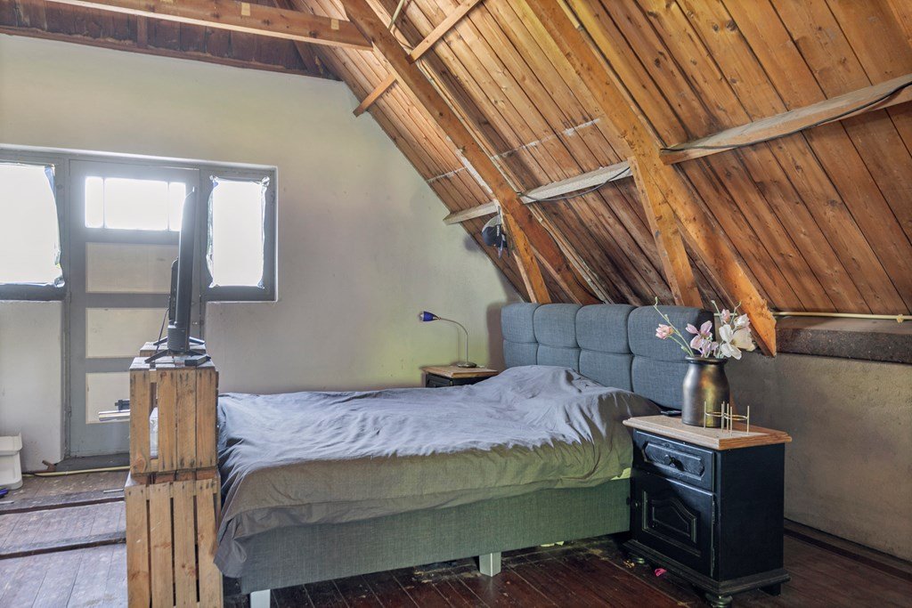 De trap in de hal aan de voorzijde geeft toegang tot de 1e verdieping. Hier bevindt zich een grote living met slaapruimte en een openslaande deur waardoor het plat dak wordt bereikt. Deze zolderruimte biedt diverse mogelijkheden voor een indeling met meerdere slaap- en/of werkruimtes.