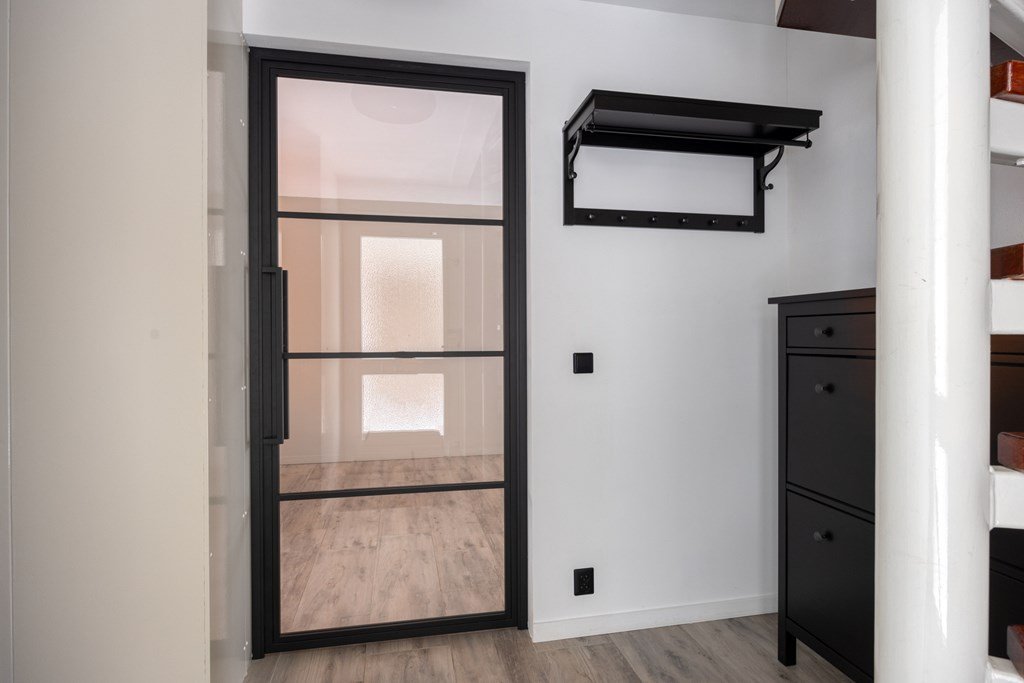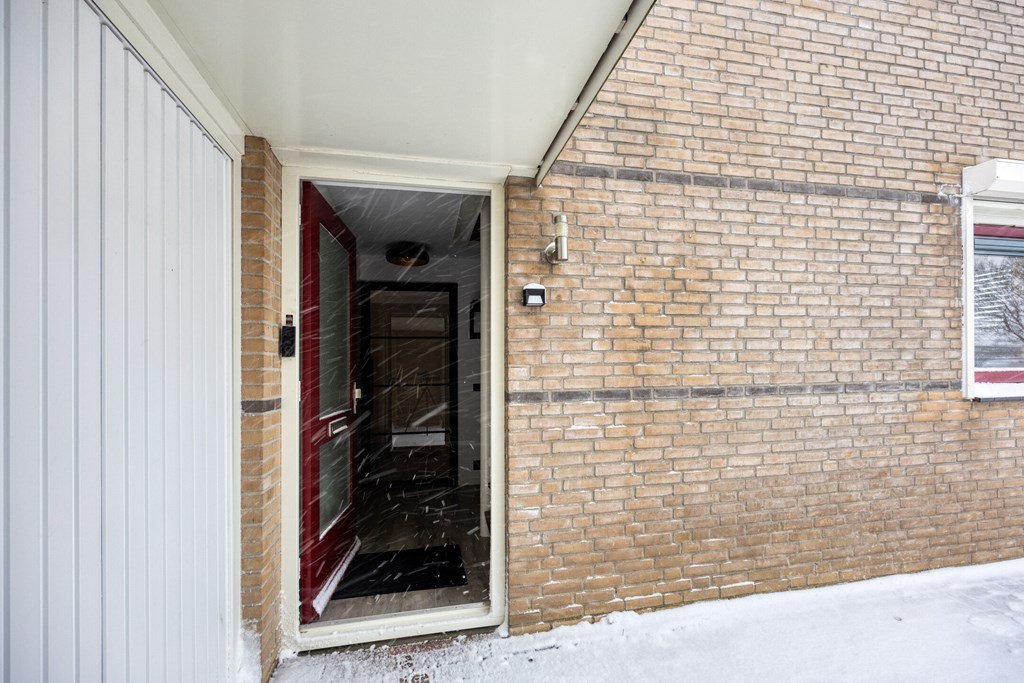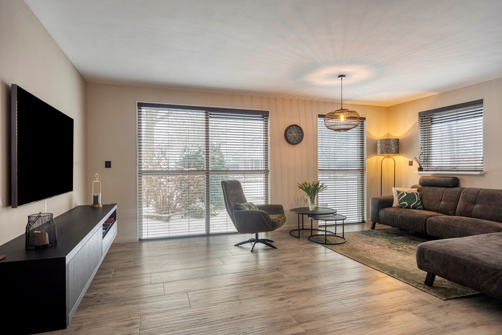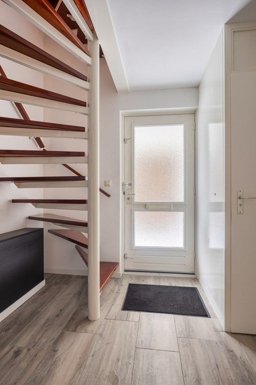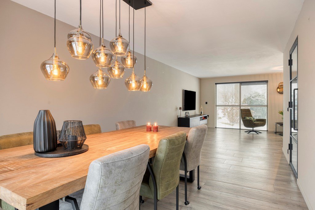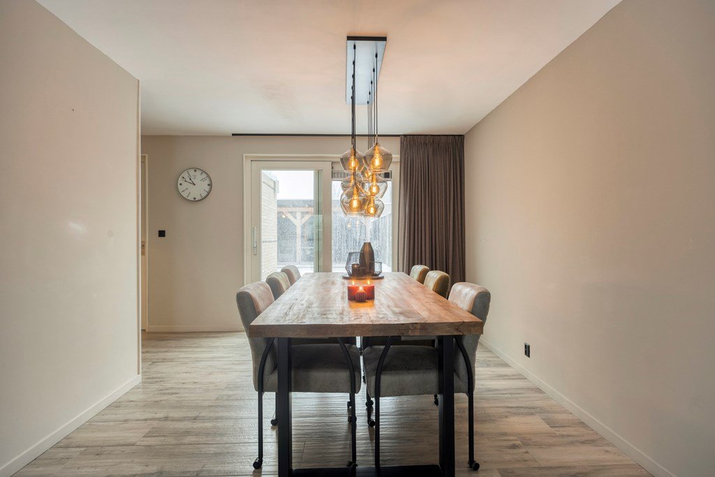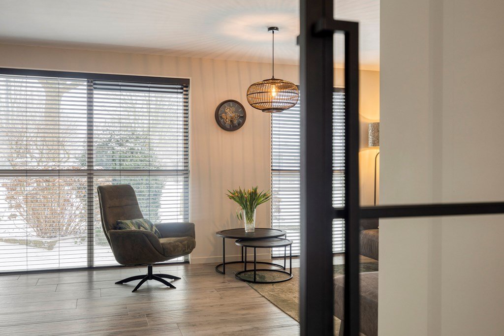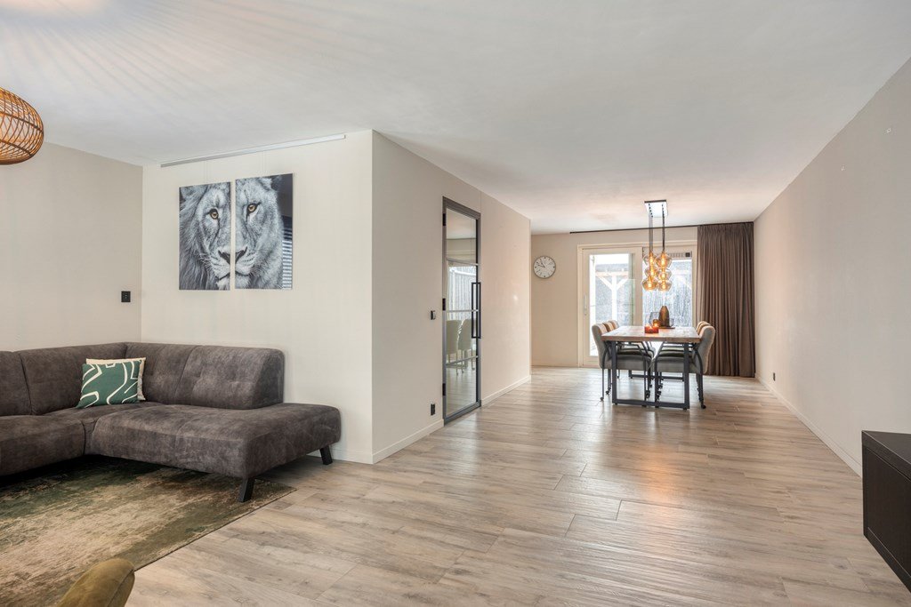 De entree aan de oprit geeft toegang tot een lichte hal met toilet, garderobe, trapopgang en meterkast. De hal leidt u door een zwart stalen deur naar de U-vormige living met zitgedeelte, eetgedeelte en open keuken.