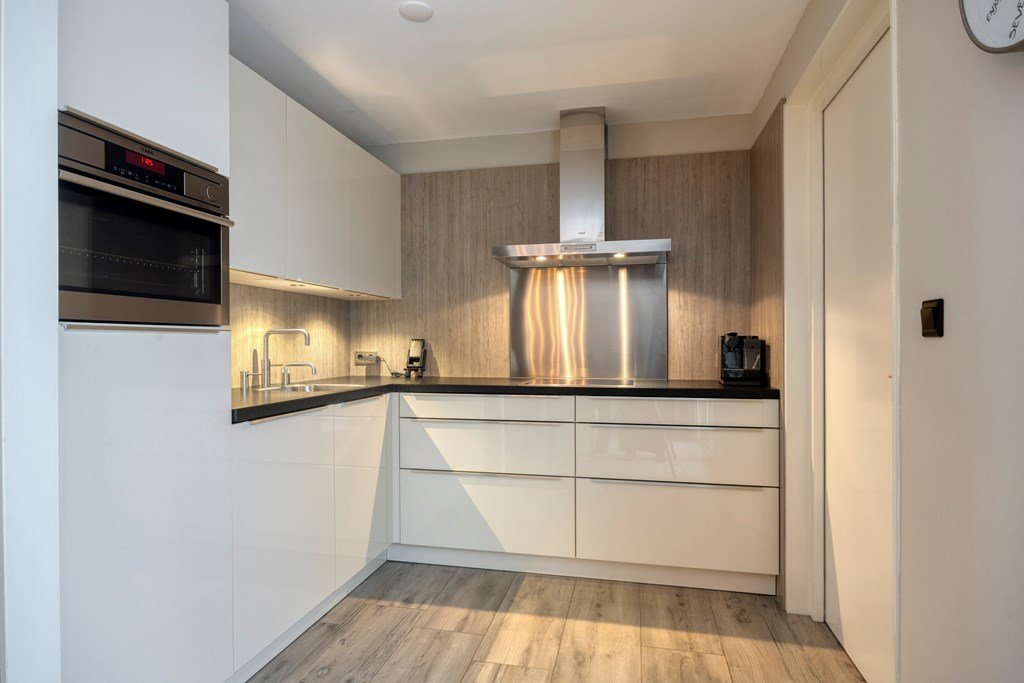 De keuken is voorzien van een hardstenen blad en diverse (AEG inbouw) apparatuur o.a. een inductiekookplaat, afzuigkap, stoomoven, koelkast, Quooker mengkraan en een vaatwasser.