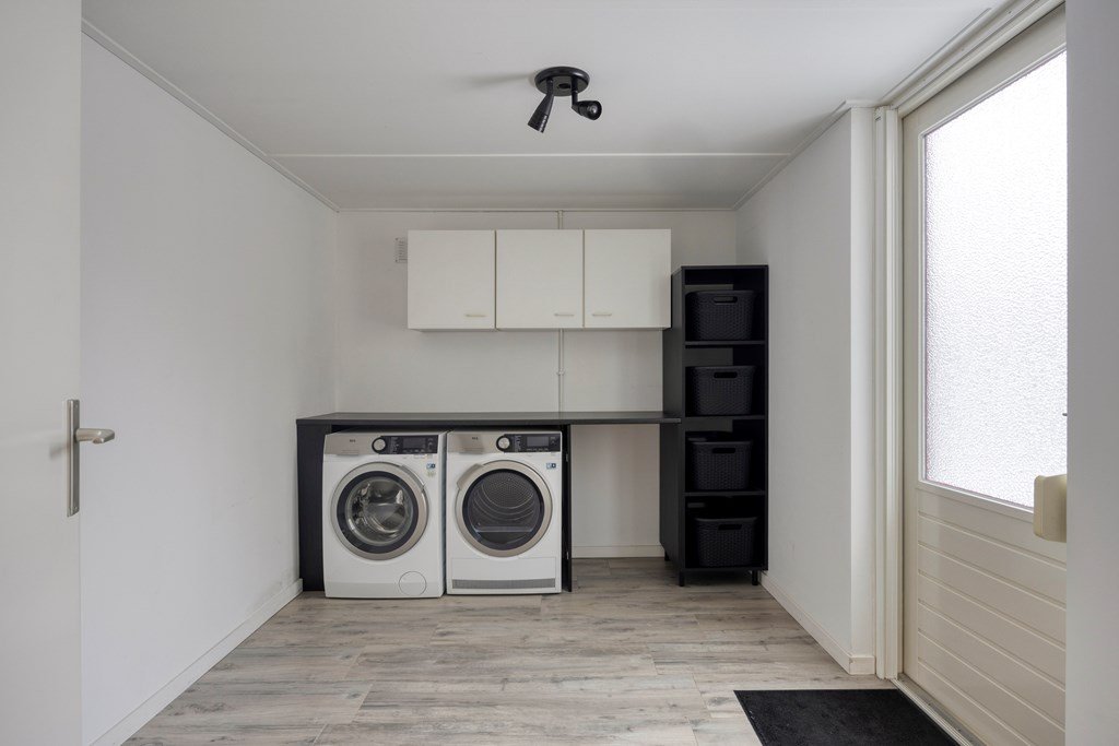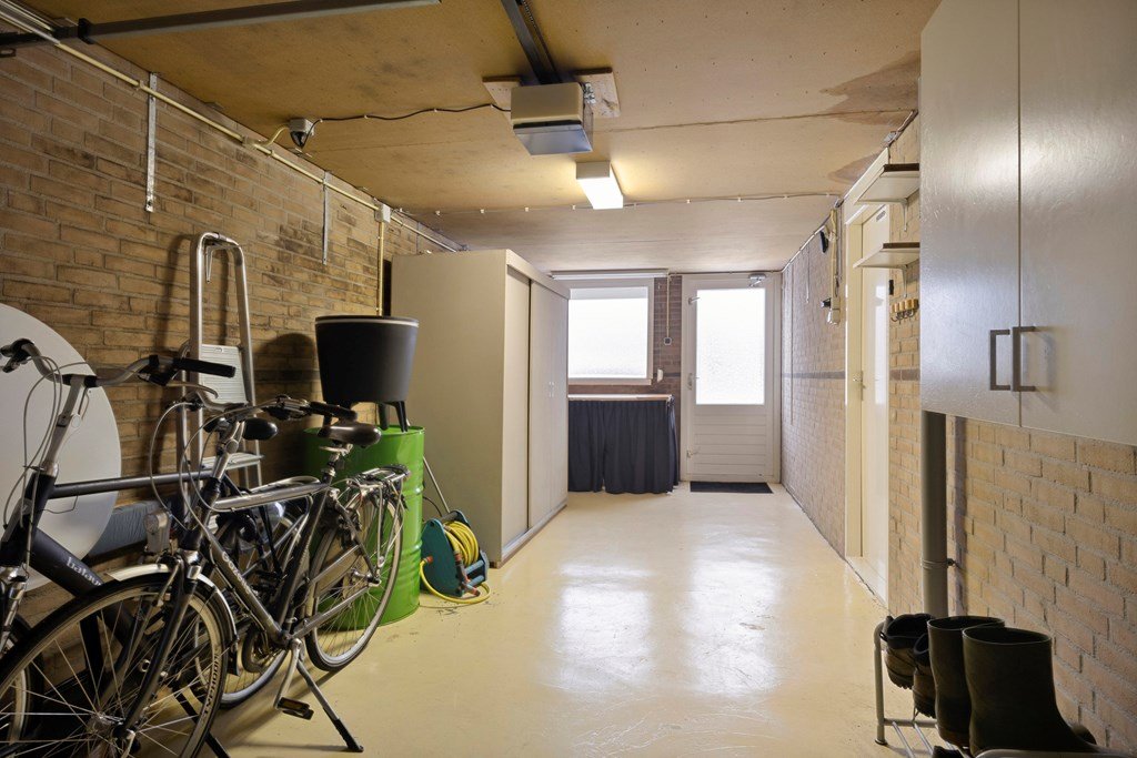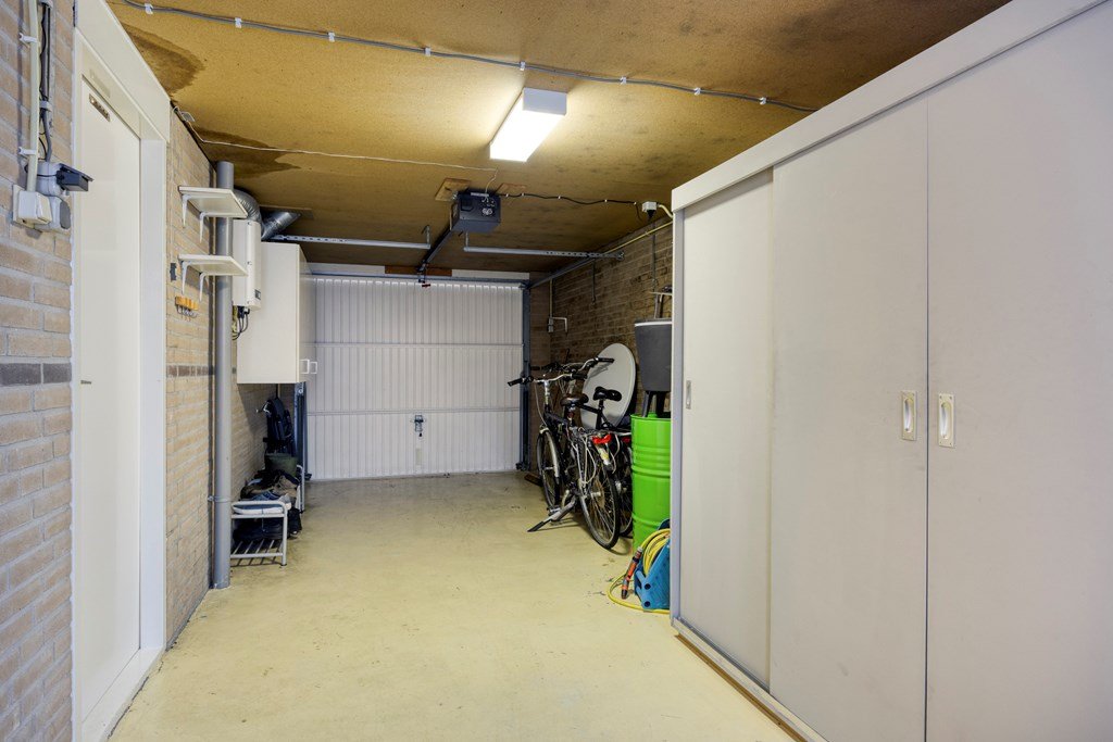 Achter de keuken bevindt zich de bijkeuken met aansluitingen voor wasmachine en droger. Vanuit de bijkeuken komt u in de ruime garage voorzien van een elektrische deur.