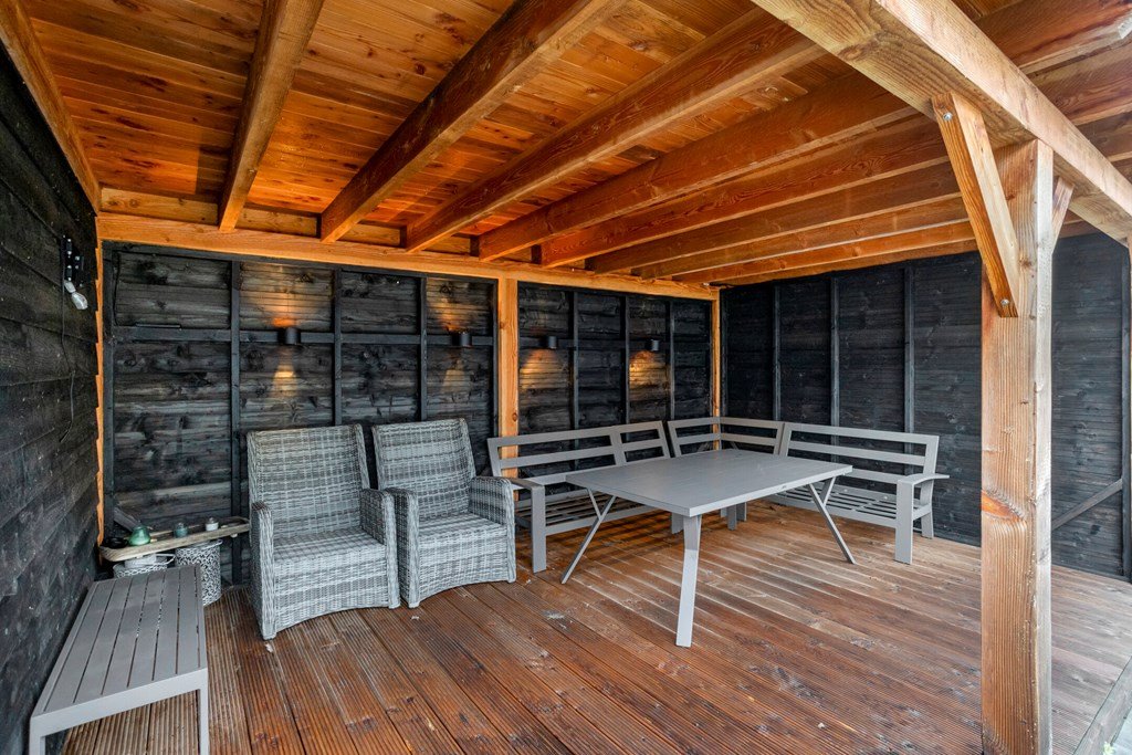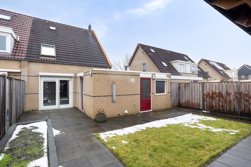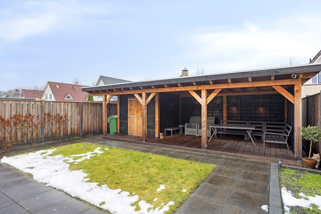 Zowel de schuifpui in de woonkamer, de deur in de bijkeuken alsook de deur in de garage geven toegang tot de comfortabel aangelegde achtertuin met een prachtig houten tuinhuis/berging met overkapping/veranda. Door de privacy en de ligging van het tuinhuis biedt deze achtertuin heerlijke mogelijkheden voor het invullen van een droomtuin waarin van de vroege ochtend tot de late avond van zon én schaduw genoten kan worden! De tuin kan ook via een eigen achterom worden bereikt.
